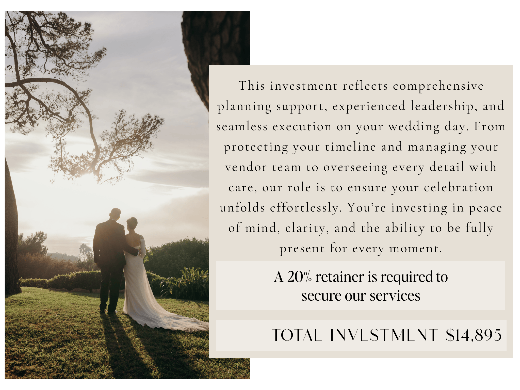 Our goal is simple: to create a wedding that feels effortless, beautifully designed, and fully reflective of you—while allowing you to be present and enjoy the process.