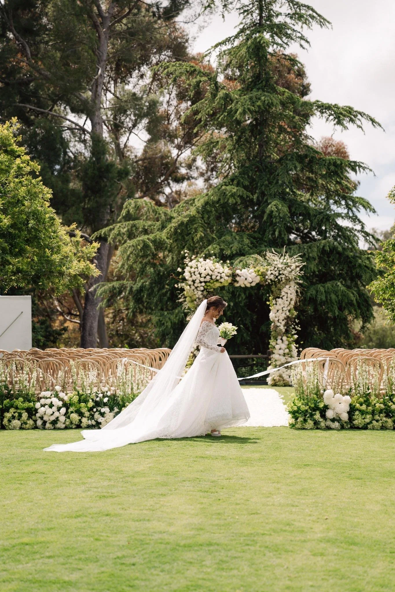 The ceremony unfolded in an intimate garden setting, where lush white and green florals and organic greenery seamlessly blended into the natural surroundings. As guests transitioned into the reception, the space evolved into an elevated outdoor experience—layered with soft textures, neutral tones, and thoughtfully arranged details that created a cohesive and inviting atmosphere.